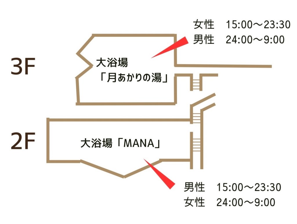 大浴場は15:00から利用可。入れ替えの30分間を除き翌朝9:00まで営業しています。