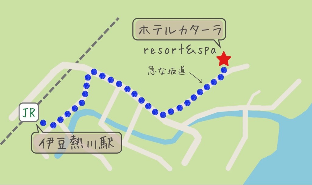 伊豆熱川駅より徒歩5分。高台にあって坂きつめですが、電車の到着時間に合わせた無料送迎があります。海が近いので、夏ならさらに楽しめそう!!