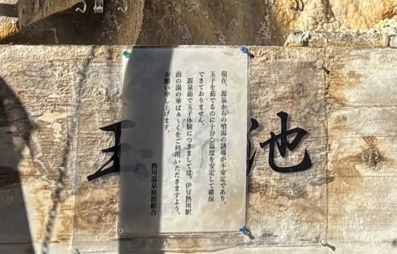 ゆで卵を作るためのザルやカゴも用意されているのですが、玉子池には『源泉の誘導が不安定で玉子を茹でるのに十分な温度が確保できていない』という張り紙が。季節や時間によると思うけど、触ってみた感じはたぶん50度くらい。
