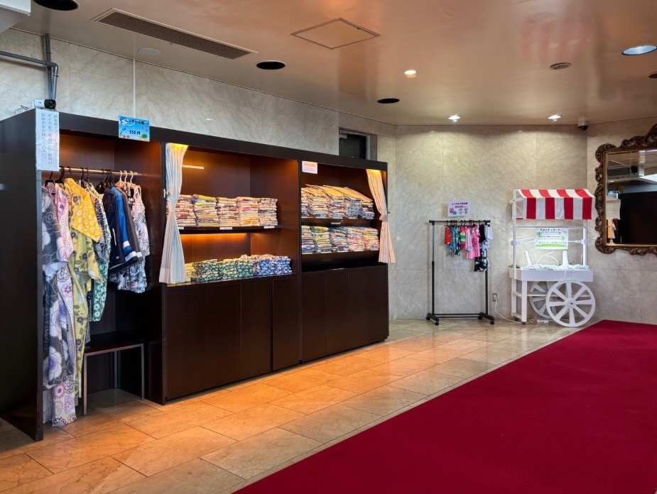 1Fエレベーター前に浴衣。キッズの浴衣は3サイズ展開。大人用も子供用も帯はお部屋にあります。