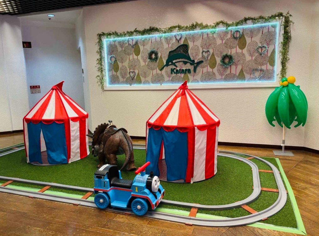 3Fはキッズ天国。エレベーター降りたらすぐ電動トーマス乗り放題!このエリアはチェックイン前の12:30から利用できます。